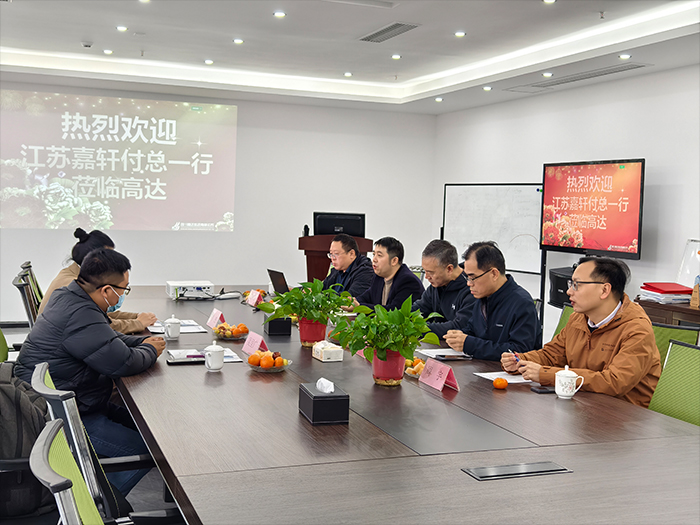 (江苏嘉轩智能科技董事长付杰正在介绍自己企业和畅谈本次合作的发展未来)