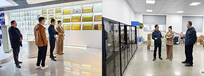 (高达公司技术肖总监(左图左三)在展厅和研发实验室(右图)向江苏嘉轩智能科技付董事长一行进行讲解介绍)